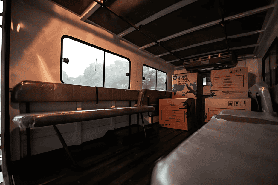 The cargo area of the ISUZU Traviz offers a versatile and functional space, ideal for transporting goods or passengers. The side benches, currently wrapped in protective plastic, provide comfortable seating for up to three people. The ample space in the rear is designed to accommodate larger items like boxes, ensuring a balance between cargo capacity and passenger comfort. The clean and simple design ensures that the interior is easy to maintain, while the large windows allow for natural light and better visibility. The air conditioning unit visible on the ceiling further enhances comfort, making the Traviz a great option for businesses that require both transportation and storage solutions in a single vehicle.